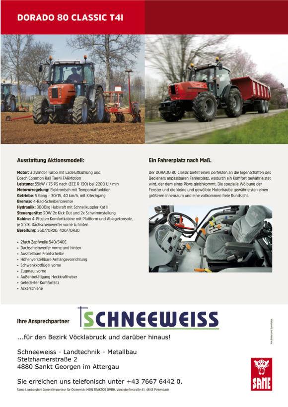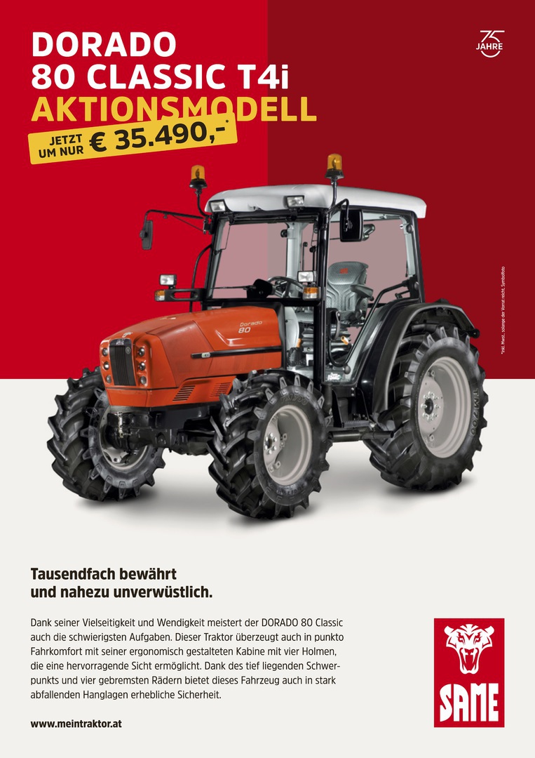 Dank seiner Vielseitigkeit und Wendigkeit meistert der DORADO 80 Classic auch die schwierigsten Aufgaben. Dieser Traktor überzeugt auch in punkto Fahrkomfort mit seiner ergonomisch gestalteten Kabine mit vier Holmen, die eine hervorragende Sicht ermöglicht. Dank des tief liegenden Schwerpunkts und vier gebremsten Rädern bietet dieses Fahrzeug auch in stark abfallenden Hanglagen erhebliche Sicherheit.